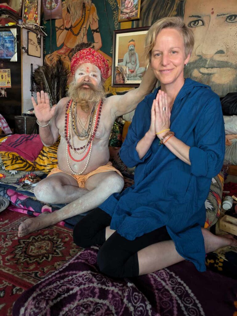חשוב לי לשתף את המסרים העמוקים, שקיבלנו שם משלוש מורות חכמות, נדיבות ושובות לב שפגשנו. הראשונה המכונה מאטה ג'י, היא יוגית חייכנית, בהירת עיניים, שחיה עם עדר של פרות ו-17 כלבים על צלע הר ליד אחד מיובלי הגנגה קרוב לרישיקש. מאטה ג'י חיה חיים שקטים כביכול של שירות, שכוללים תחזוקת המקדש הסמוך (שהוא בעצם עץ ענק) לאלה קאלי, טיפול בחיות ומדי פעם תמיכה באנשים, שמגיעים אליה לייעוץ או מנוחה מעומס החיים. זאת הסדהנה שלה.